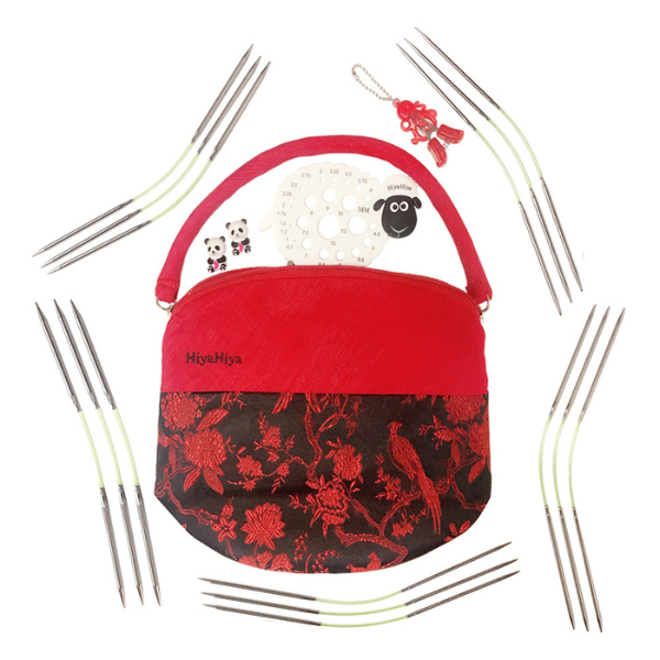 Sættet indeholder 5 x 4 faste Steel Flyer pindespidser, 4 wires, en lille saks, en lille Panda pindestopper, et målefår, samt en smuk syet strikkepung, som har ekstra rum til f.eks. maskemarkører og andre småting. Pungen kommer i assorterede farver.
